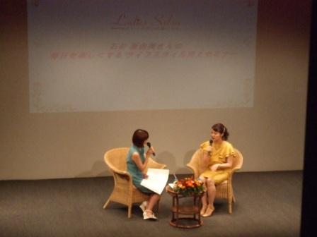写真は、MCの方とのカラーセラピーについて対談している風景です。