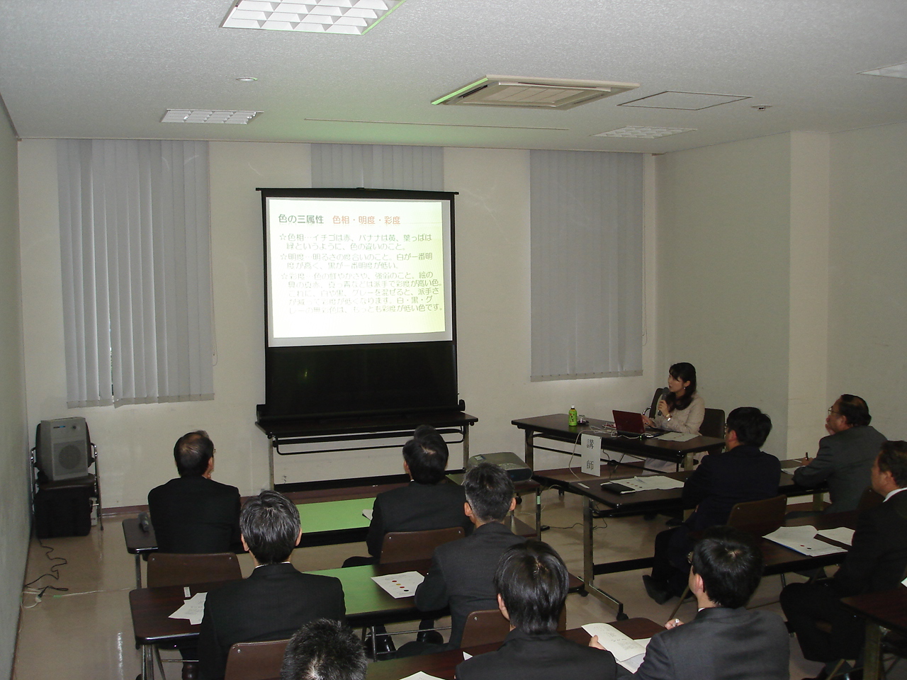 今回は職員の皆様方に、カラーコーディネートの基本的知識、社会に活かすカラーセラピー活用術(青色防犯灯など多数の事例をベースに)、カラーセラピーの知識や歴史、壁材と反射率の関係、ユニバーサルカラーのことなど、お伝えしました。